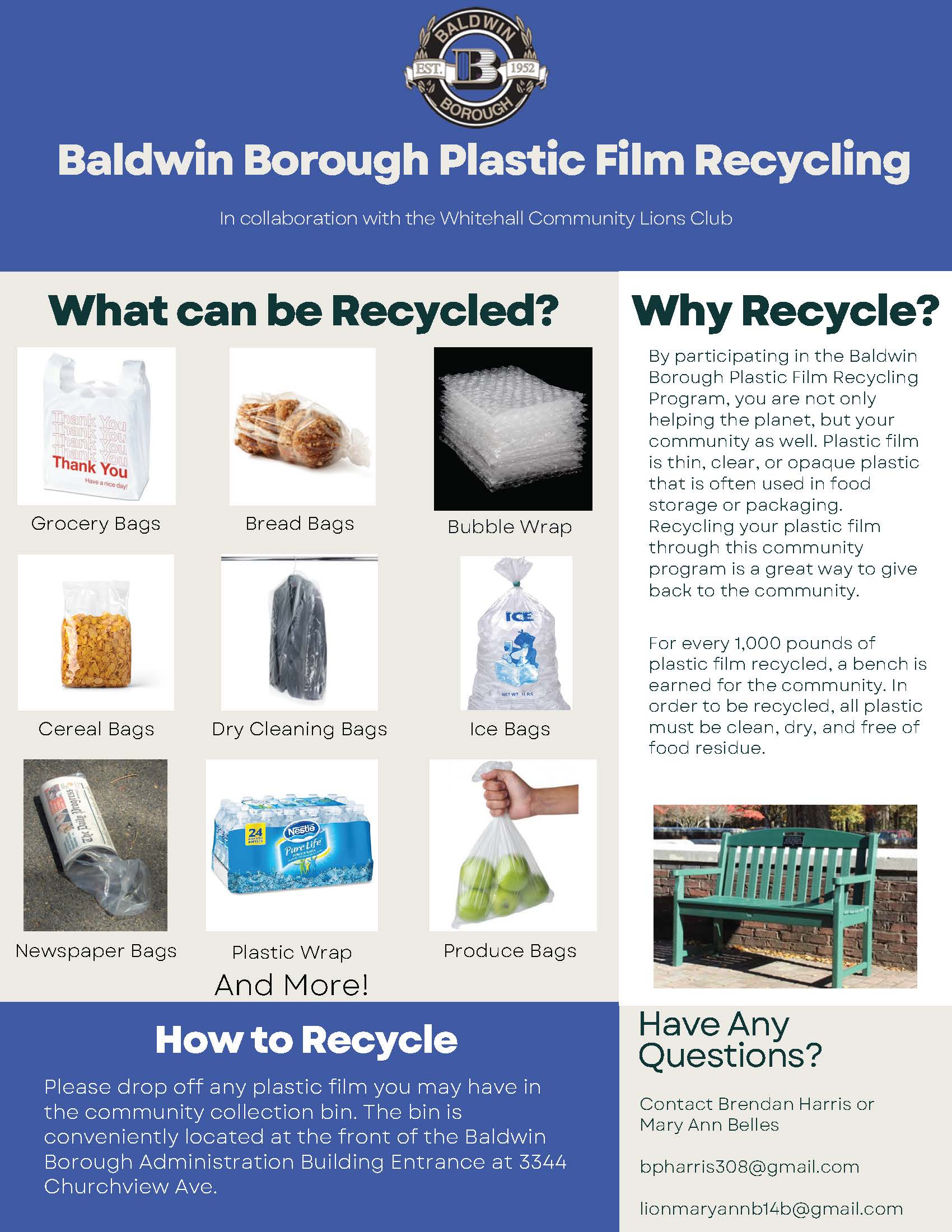 By participating in the Baldwin Borough Plastic Film Recycling Program, you are not only helping the planet, but your community as well. Plastic film is thin, clear, or opaque plastic that is often used in food storage or packaging. Recycling your plastic film through this community program is a great way to giveback to the community.
